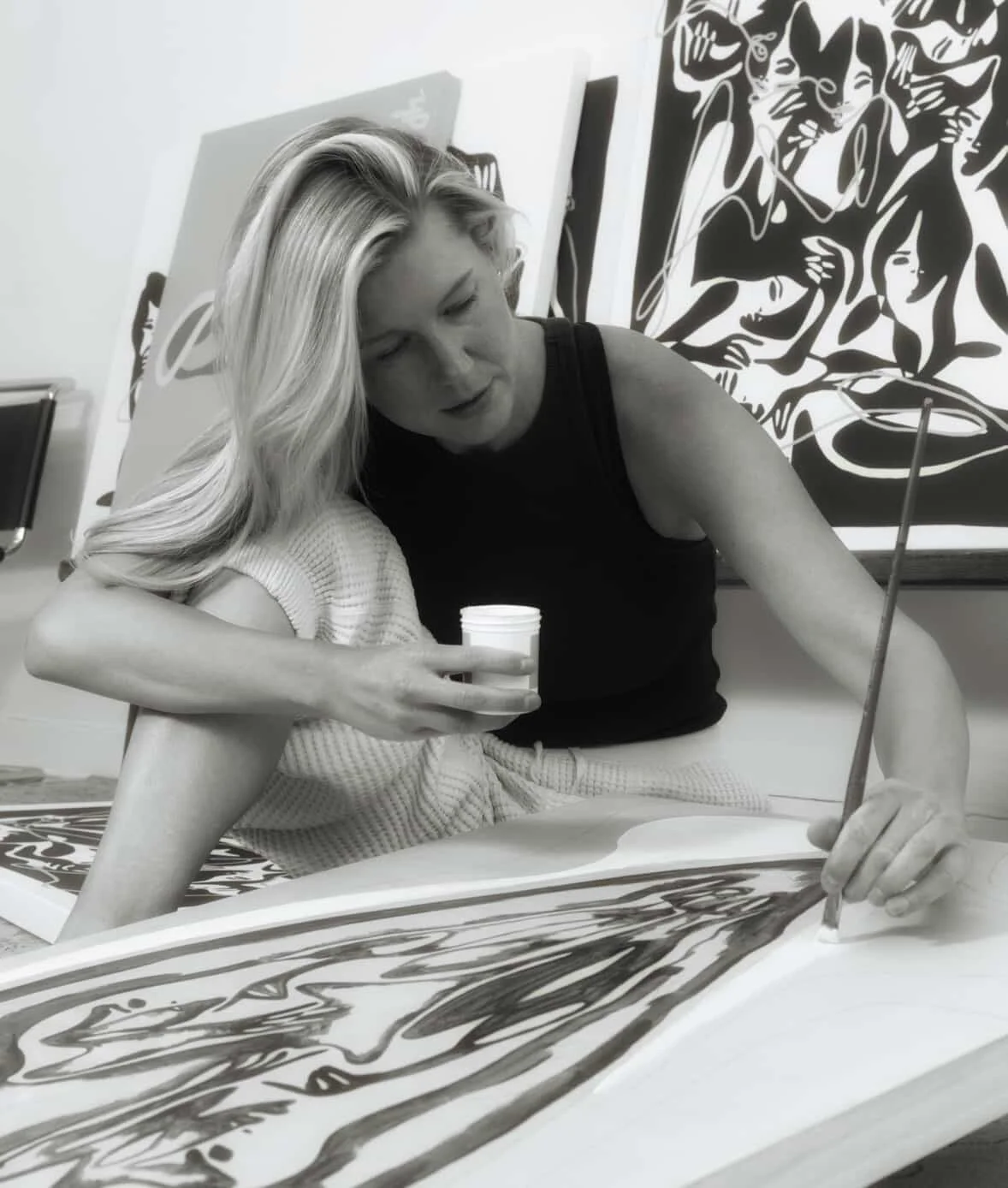With a background in fashion and product design, her paintings serve as a visual diary and tool to process her own experiences and observations. She focuses on continuous line work within figurative acrylic artworks to embody universal emotions that facilitate human connection. She believes that in the same way the physical body uses the movements of gesture as a language, the spirit uses energetics. She materializes this invisible energetic language by distilling it into a single, continuous line of intrinsic and intuitive movement.